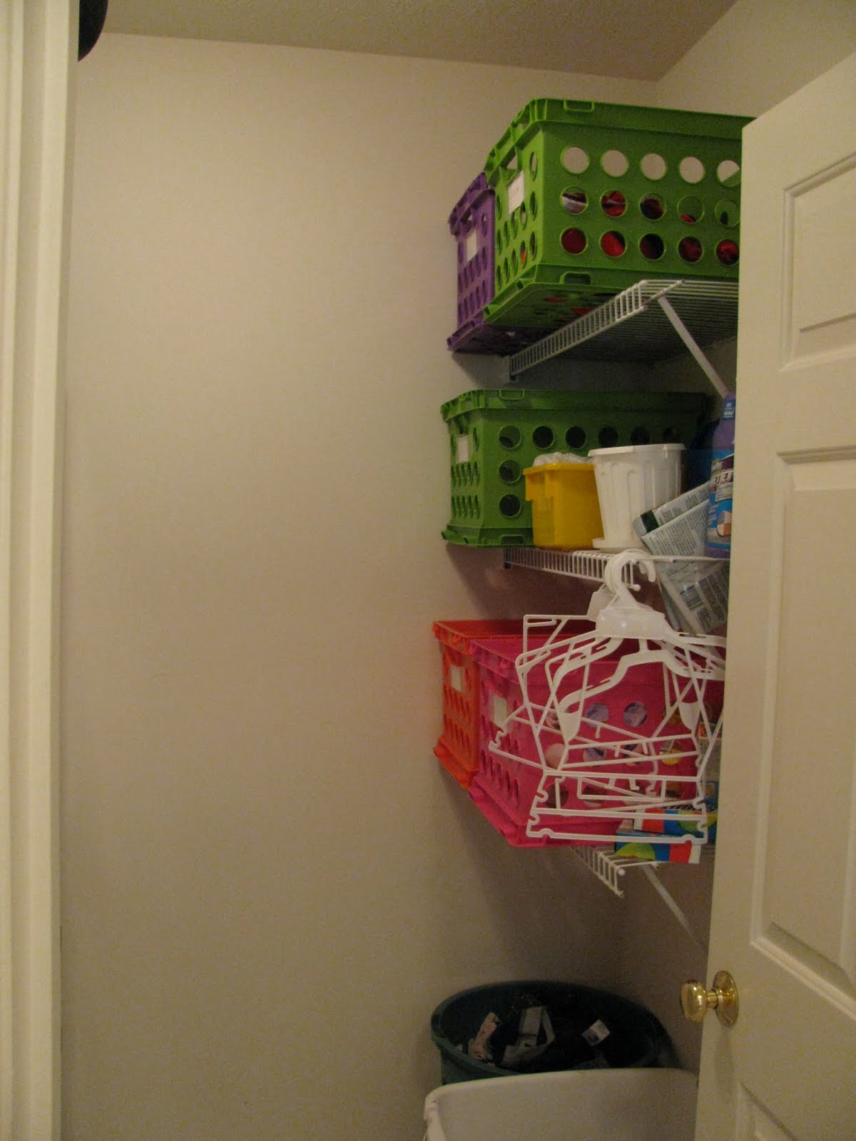 My husband took shelves from our master bedroom closet and hung them in the laundry room (a room that is a tiny bit bigger than a half bath.) That means, I have the original set of shelves, just over the washer and now a set of shelves across from it. Yes, I have to be very careful how I stand up, so as to avoid bashing my head or bottom into a shelf. I have adapted and have not had a bonk on either end in over a year. The shelves across from the washer hold a bin for every child in the family and one for socks. As I pull clothes out of the dryer, I sort them straight into these bins. Adult clothes, sheets, towels and the like go into a basket at my feet. Each child is responsible for folding their clothes each day. Some days that means a lot of folding, some days just a little. I have found this VERY helpful in discouraging my 7-year-old's tendency to wear 3-4 outfits a day! The younger the child is, the more help they get from either a parent or an older sibling. So far, this system has been a big help. Renovating my laundry room this way cost us about $14, the cost of 5 bins and a couple molly bolts (two of the support beams for the shelves lined up nicely with studs in the wall, but the middle one did not) and 2 hours of measuring, hanging, fuming, muttering about the confusion of being taught two systems of measurement and rehanging the shelves.